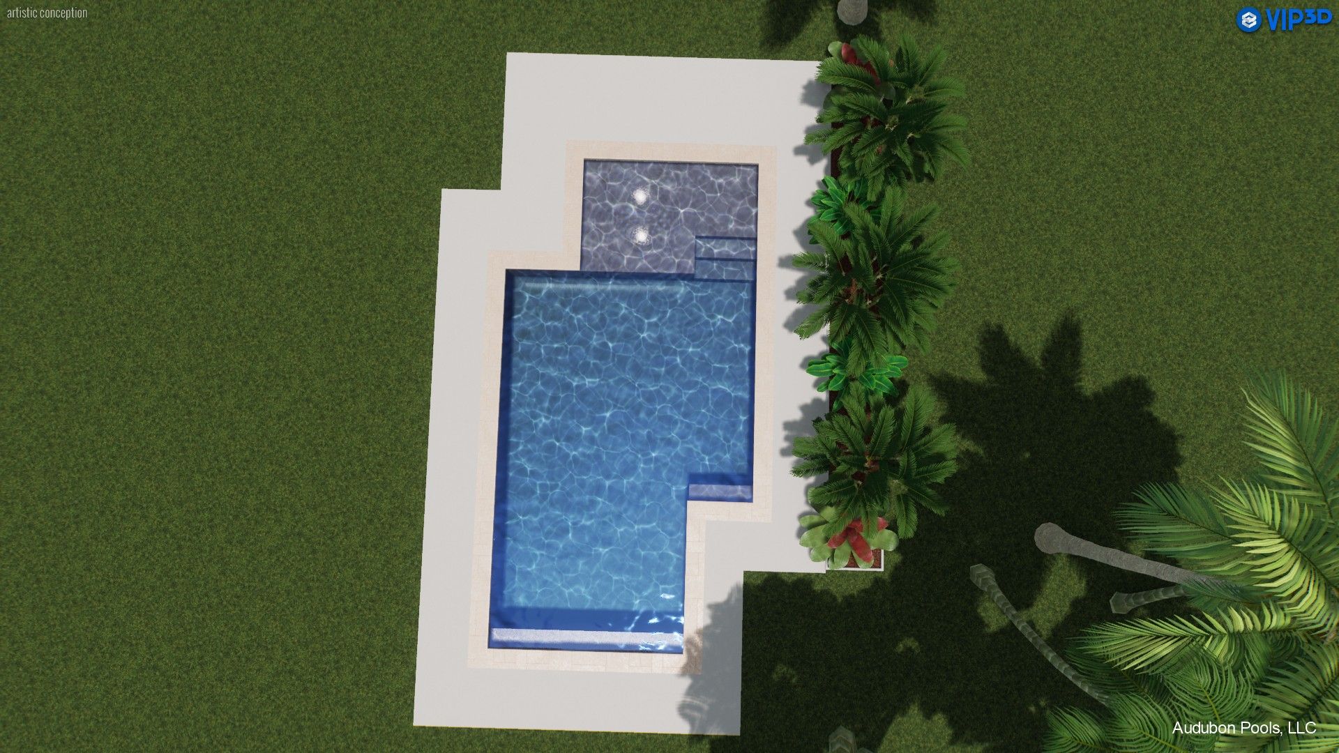 - Enjoy 400 sq. ft. of refreshing swimming space — 496 sq. ft. total with coping — complemented by 400 sq. ft. of broom-finished concrete decking for a complete backyard design.