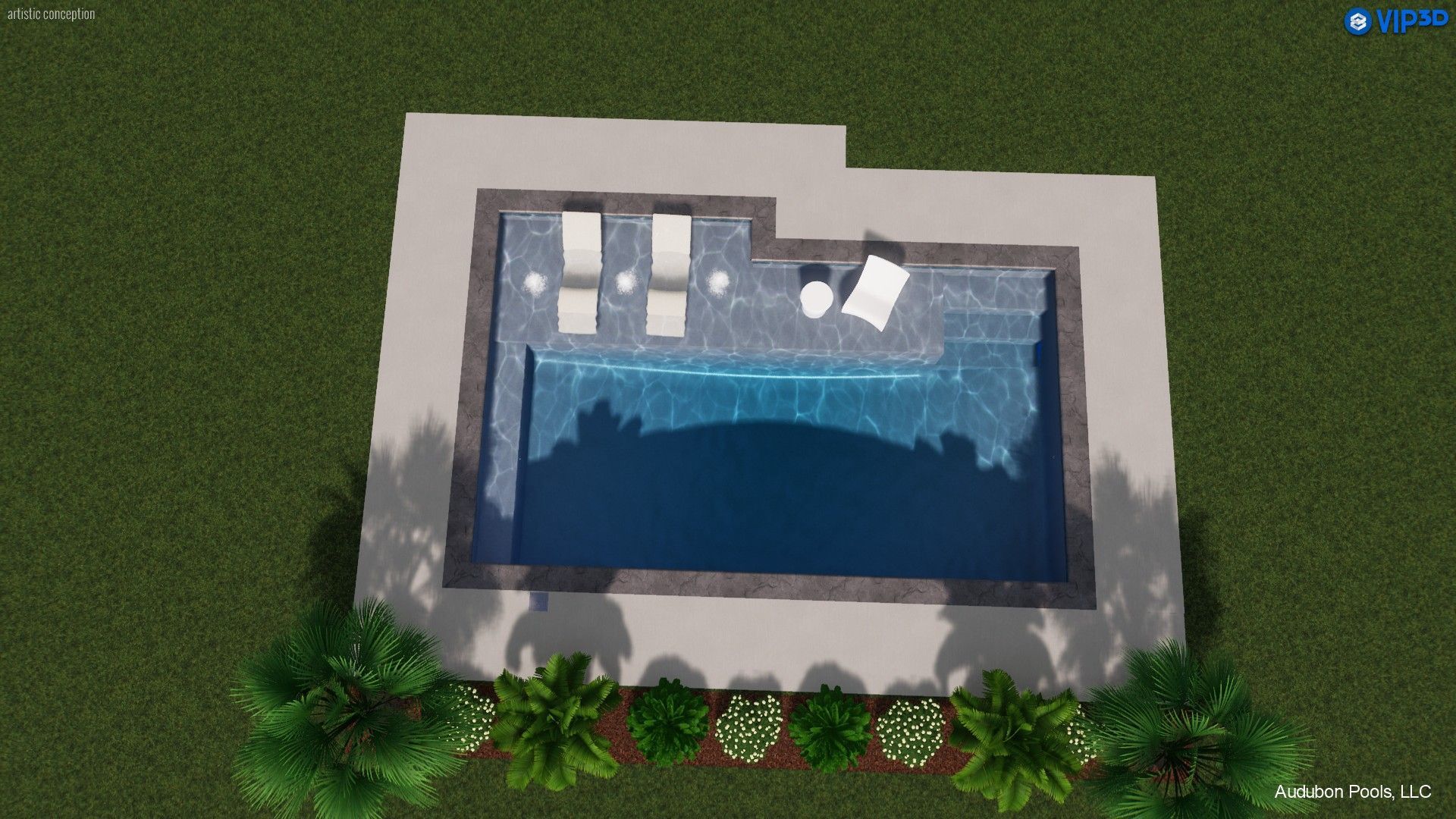 - Enjoy 400 sq. ft. of refreshing swimming space — 496 sq. ft. total with coping — complemented by 400 sq. ft. of broom-finished concrete decking for a complete backyard design.