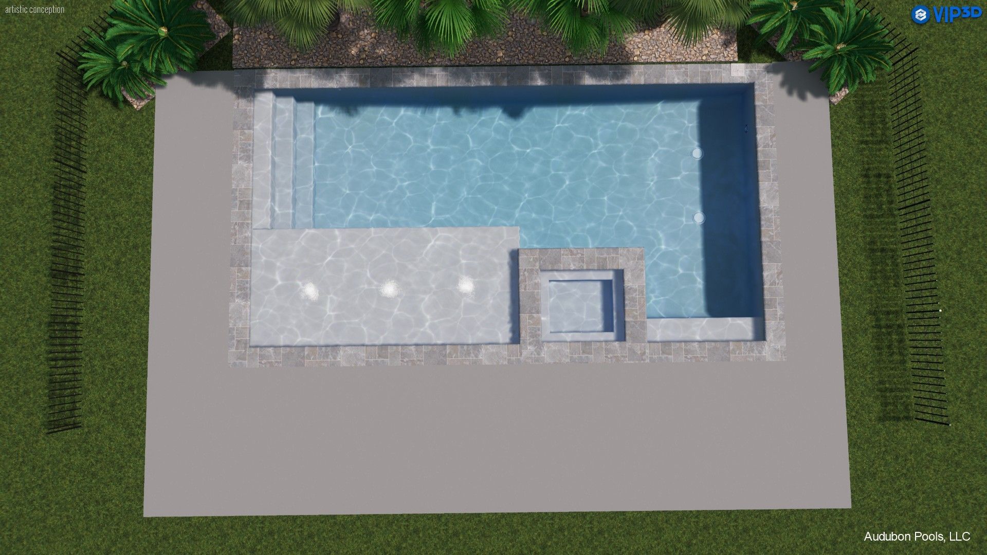 Enjoy 450 sq. ft. of refreshing swimming space — 550sq. ft. total with coping and spa— complemented by 450 sq. ft. of broom-finished concrete decking for a complete backyard design.